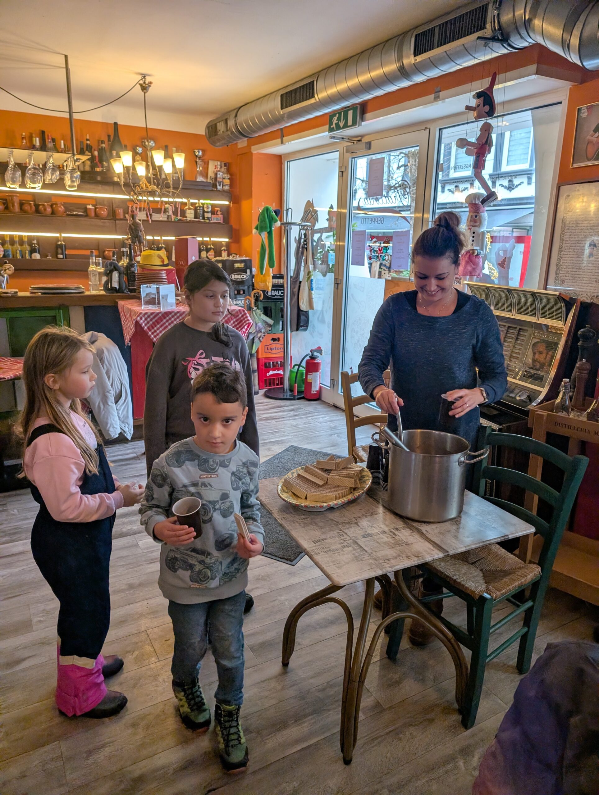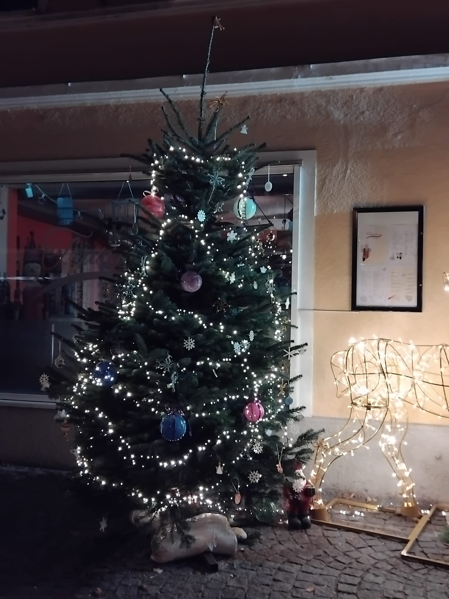 Jährliche Tradition: das Weihnachtsbaumschmücken vor der Trattoria Geppetto (1b+2b: Dezember)